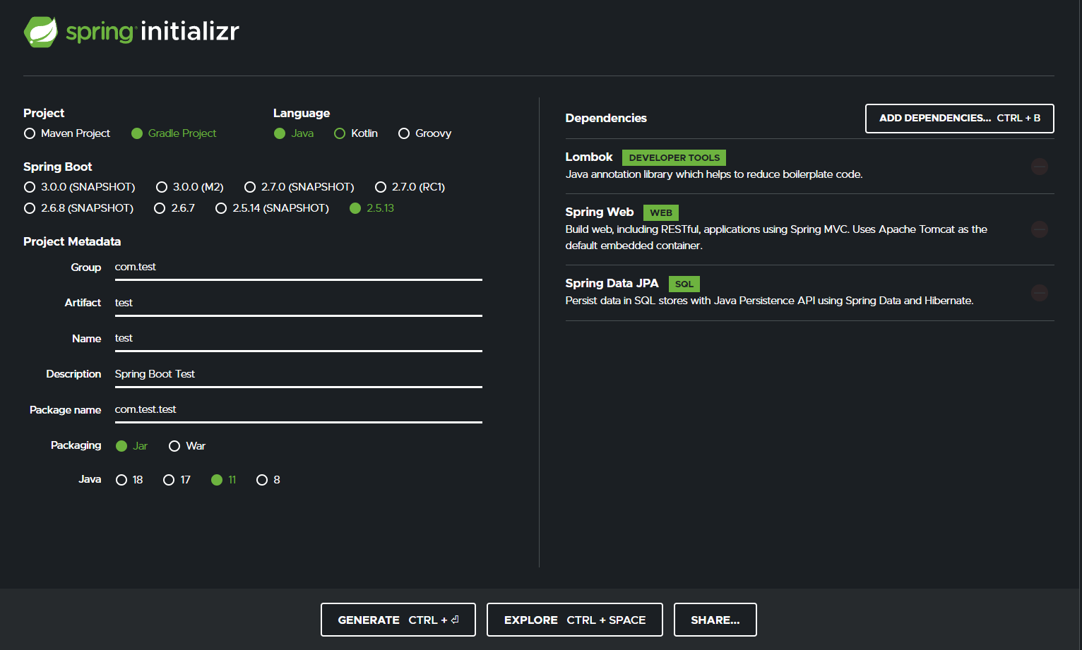 이후 생성된 ZIP 파일 압축풀고 이클립스나 인텔리제이 등 IDE를 열어 사용