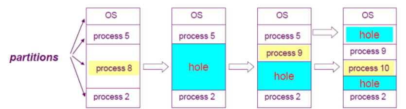 사용 가능한 메모리 블록인 공간(hole)의 크기가 다양하여, 새로운 프로그램이 도착하면, 적재 가능한 충분한 크기의 메모리 공간을 할당해 주는 방식이다.